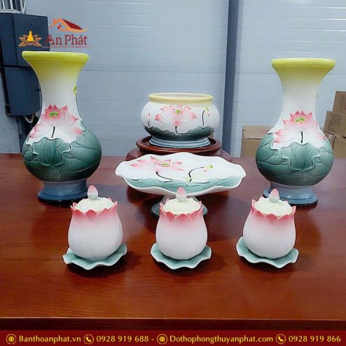 Bộ Đồ Thờ Gốm Sứ Hoa Sen Cao Cấp Đỏ Nổi GS1210