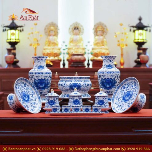 Đồ Thờ Gốm Sứ Cao Cấp Sứ Sen Nổi Trắng Xanh GS1186