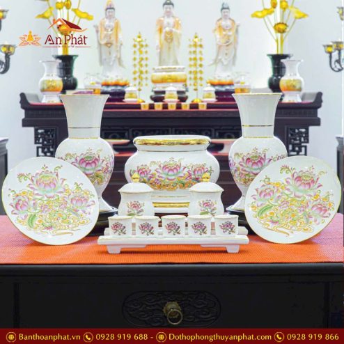 Đồ Thờ Gốm Sứ Sen Tam Bảo Trắng Cao Cấp GS1187