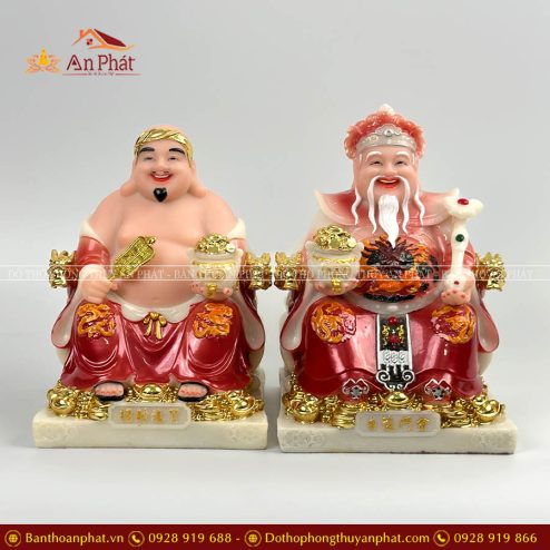 Tượng Thần Tài Ông Địa Bộ 2 Ông Chậu Vàng Đá Cao Cấp Đỏ T0196